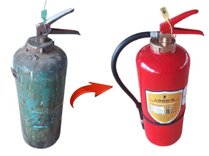 extincteurs rechargés sont soigneusement examinés, et de nouvelles pièces internes sont